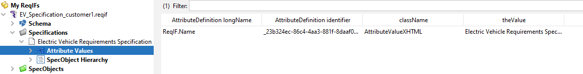 The AttributeValues folder contains all AttributeValues in a Specification, SpecRelation or SpecObject. When you select this folder, the Table View of the AttributeValues collection is shown. All the features of the Table View are present in this table.