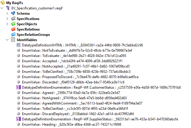 The Identifiables folder, when it is located inside a ReqIF file, contains every ReqIF object that has an identifier property i.e., Identifiable. Each Identifiable node inside the folder can be individually selected to view its details.