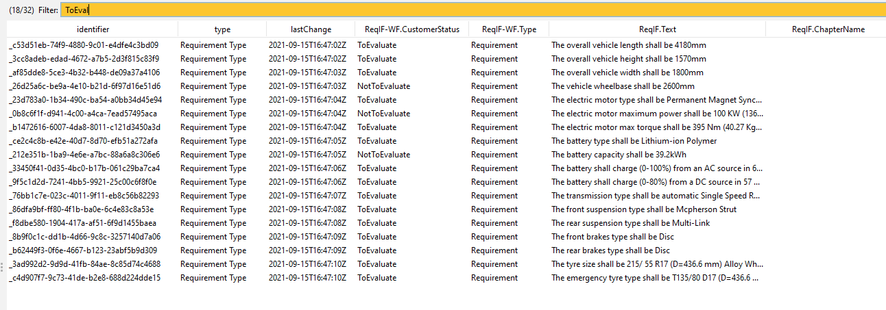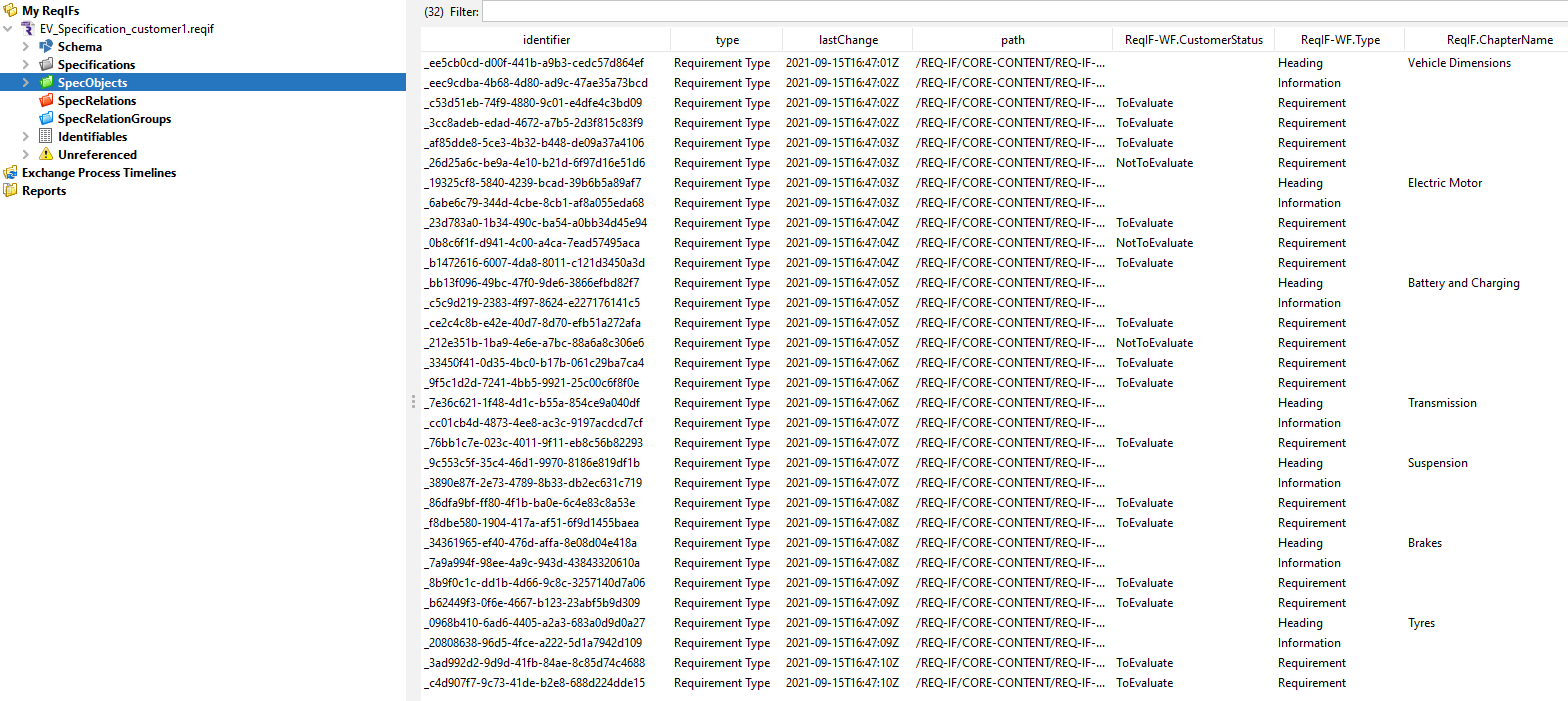 The SpecObjects folder contains all the SpecObjects that are inside the ReqIF file displayed as a single flat list. The order in which they are displayed reflects the order in which they have been defined in the ReqIF file. When you select the SpecObjects folder, a Table View is displayed on the right hand side of the application window. This table contains every SpecObject with the Identifiable properties displayed individually in columns.