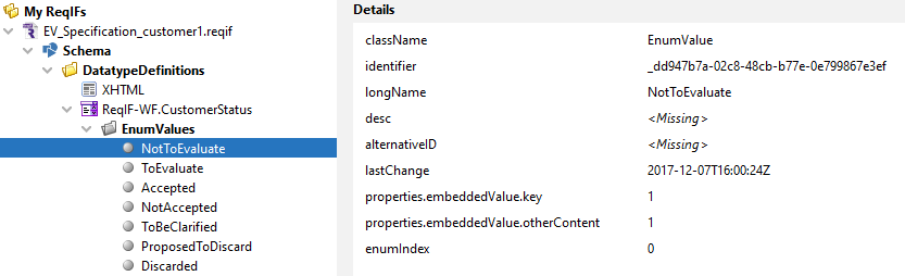 An EnumValue node is located inside the EnumValues folder of a DatatypeDefinitionEnumeration node. When you select an EnumValue node, the Details Window will update to display the following information.