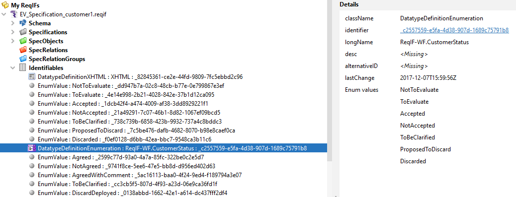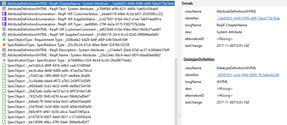 The Identifiable Node is a child node of the Identifiables folder. This folder can be found inside the ReqIF file node and also a SpecHierarchy node that is itself inside an Identifiables folder (explained in more details below) and similarly a Specification node.