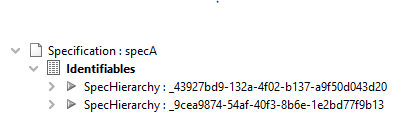 If the SpecHierarchy has child SpecHierarchy objects i.e., it is the parent of one or more children, then an Identifiables folder will be visible inside the SpecHierarchy node. This Identifiables folder contains the child SpecHierarchy objects and has all the characteristics and features of the ReqIF file Identifiables folder.