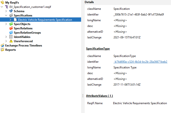 The Specification node is the root node for a Specification in a ReqIF file. When you select this node, the Details Window will update to show the Identifiable properties of the Specification: