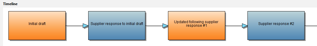 An Exchange Process Timeline is that period of time commencing with the release of the first draft of a specification and ending with acceptance of the specification. A timeline can be visualized as the sequence of ReqIFs which have been exchanged between the customer and supplier. The first ReqIF is always the customer's initial draft and this forms the reference point for all subsequent ReqIFs. The final ReqIF would be the one where the supplier has evaluated all requirements and responded in such as way as to set each requirement to a terminal state - normally 'Accepted'.