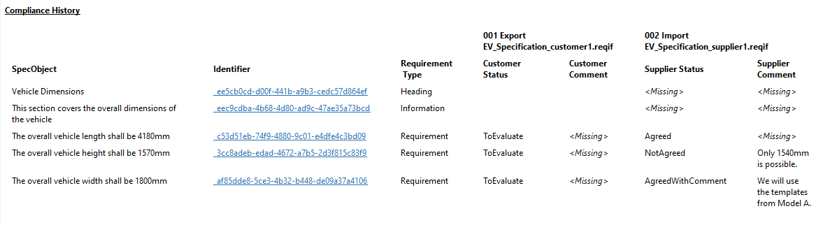 In the details view, when a customer ReqIF is added to the timeline, the values of the Customer Status and Customer Comment attributes are shown for each requirement. Similarly, when a supplier ReqIF is added to the timeline, the values of the Supplier Status and Supplier Comment attributes are shown. This make it easy to see